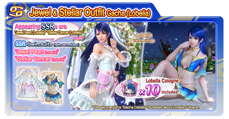 In “Jewel & Stellar Outfit Gacha (Lobelia),” the only SSR and SR Swimsuits that appear will be Lobelia-exclusive Swimsuits. The SSR Swimsuit “Jewel Pearl (Lobelia)” and “Stellar Cancer (Lobelia)” are available through this gacha, and its level will always be Lv. 90 when acquired.