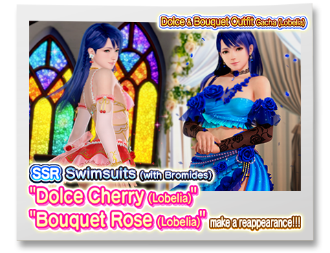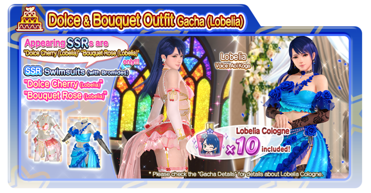 SSR Swimsuit “Dolce Cherry (Lobelia)” and SSR Swimsuit “Bouquet Rose (Lobelia)” are not included in the “Weekly SSR Ticket Gacha,” “Weekly Gacha,” “SSR Swimsuit Ticket Gacha,” “SR Swimsuit Ticket Gacha,” or “Venus Gacha.” However, they may be added in the future.