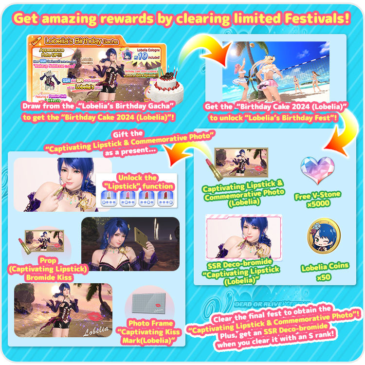 Take on the Lobelia's Birthday Fest to get the “Captivating Lipstick & Commemorative Photo (Lobelia)” special gift item and SSR Deco-bromide.