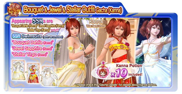 The only SSR swimsuit(s) to appear in “Bouquet & Jewel & Stellar Outfit Gacha (Kanna)” is (are) “Bouquet Dahlia (Kanna),” “Jewel Sapphire (Kanna),” “Stellar Virgo (Kanna)”.