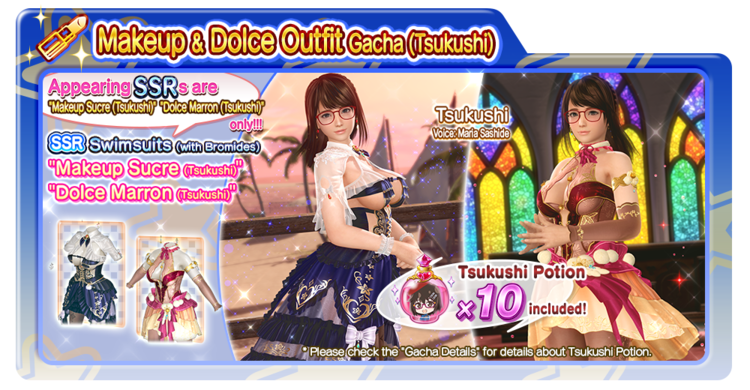 The only SSR swimsuit(s) to appear in “Makeup & Dolce Outfit Gacha (Tsukushi)” is (are) “Makeup Sucre (Tsukushi),” “Dolce Marron (Tsukushi)”.
