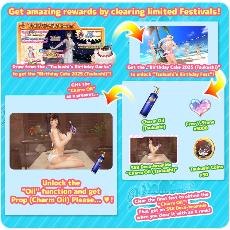 Take on the Tsukushi's Birthday Fest to get the “Charm Oil (Tsukushi)” special gift item and SSR Deco-bromide.
