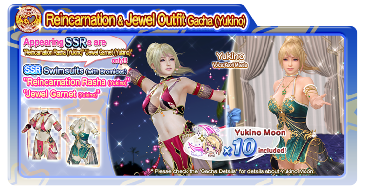The only SSR swimsuit(s) to appear in “Reincarnation & Jewel Outfit Gacha (Yukino)” is (are) “Reincarnation Rasha (Yukino),” “Jewel Garnet (Yukino)”.