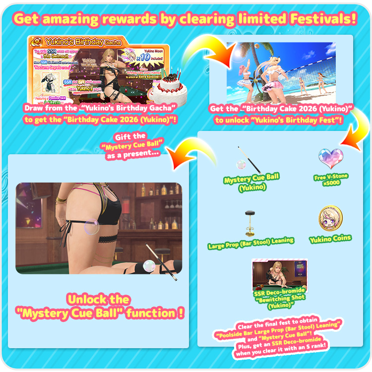 Take on the Yukino's Birthday Fest to get the “Mystery Cue Ball (Yukino)” special gift item and SSR Deco-bromide.