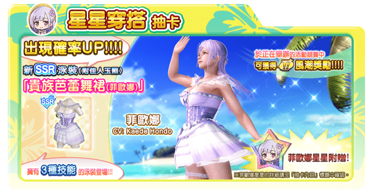 在限定期間的「星星穿搭抽卡」中獲得「菲歐娜」專用SSR泳裝「貴族芭蕾舞裙(菲歐娜)」,可以招待菲歐娜。