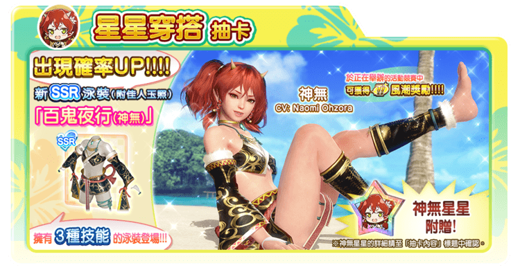 在限定期間的「星星穿搭抽卡」中獲得「神無」專用泳裝「百鬼夜行(神無)」,可以招待神無。