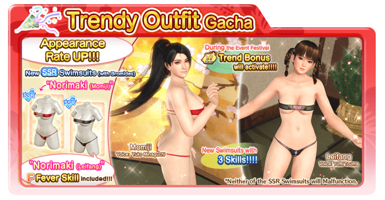 Through the Gacha below, you can get the following SSR Swimsuits that will activate Trend Bonuses during the Event Festival.
