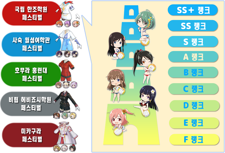 각 세력별로 구성된 이벤트 페스티벌에 해당 세력과 동일한 SSR 수영복을 페스티벌 코디에 장비 시키면