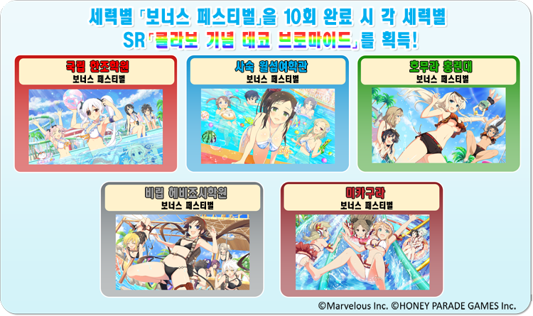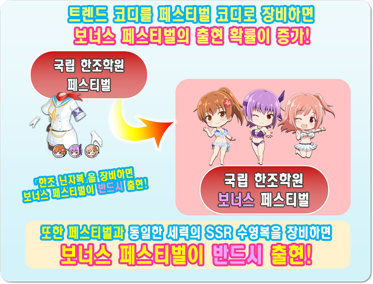 또한 각 세력별 「페스티벌」과 동일한 세력의 SSR 트렌드 수영복을 장비 후 도전하면 도전한 세력의 「보너스 페스티벌」이 반드시 출현합니다!