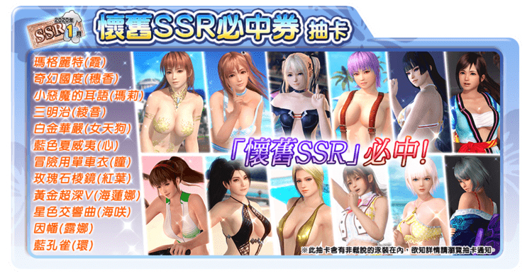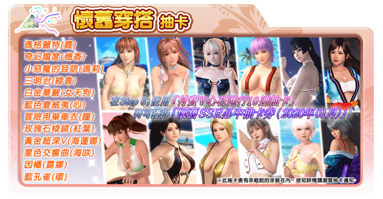 ※ | 「懷舊SSR必中券抽卡(2020年01月)」中會出現的SSR泳裝只包含「懷舊穿搭抽卡」中出現的各位女孩的泳裝。 |