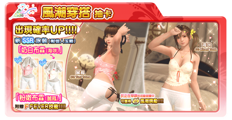 「風潮穿搭抽卡(麗鳳・海咲)」將提高下列泳裝的提供機率: