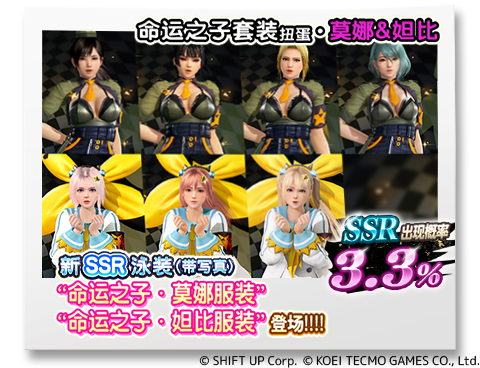 | ※ | PICK UP对象的泳装,是限期出现的泳装。 “SSR泳装保底券扭蛋”“维纳斯扭蛋”不包含以上内容。但之后有可能添加。  |