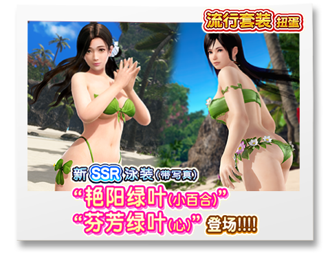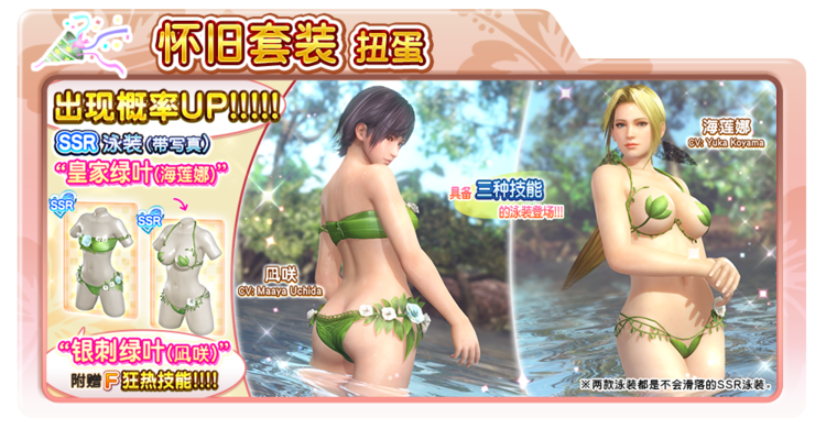 | ※ | SSR泳装“芬芳绿叶(心)”和SSR泳装“艳阳绿叶(小百合)”为限期出现的泳装。 “SSR泳装保底券扭蛋”“维纳斯扭蛋”不包含以上内容,但之后有可能添加。 |