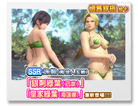 ※ | SSR泳裝「芬芳綠葉(心)」及SSR泳裝「艷陽綠葉(小百合)」為限定期間的泳裝。 「SSR泳裝必中券抽卡」及「維納斯抽卡」並不包含以上的泳裝,但之後仍有新增的可能性。 |