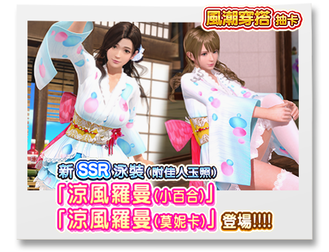 ※ | 「涼風羅曼(小百合)」及SSR泳裝「涼風羅曼(莫妮卡)」 不包含在「SSR泳裝必中券抽卡」及「維納斯抽卡」之内,但之後仍有新增的可能性。 |