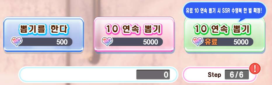| ※ | 「Step 6/6」의 무료 10 연속 뽑기를 하더라도, 「Step 6/6」의 상태로 남아 유료 10 연속 뽑기를 할 수 있는 상태가 됩니다. |
