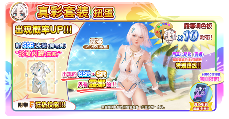 每一次进行“真彩套装扭蛋(露娜)”扭蛋后,将会附送“露娜调色板”。您可以在VIP商店的“露娜调色板特惠兑换处”,以200个“露娜调色板”换取1套露娜专用SSR泳装。