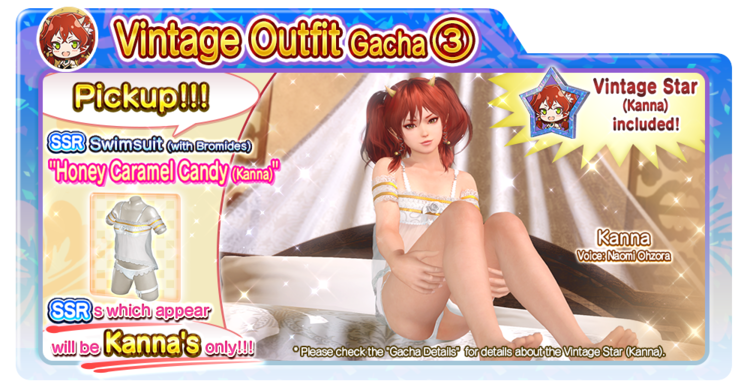| ※ | SSR Swimsuit “Honey Caramel Candy (Kanna)” is not included in the “Weekly SSR Ticket Gacha,” “Weekly Gacha,” “SSR Swimsuit Ticket Gacha” or the “Venus Gacha.” However, they may be added in the future. |