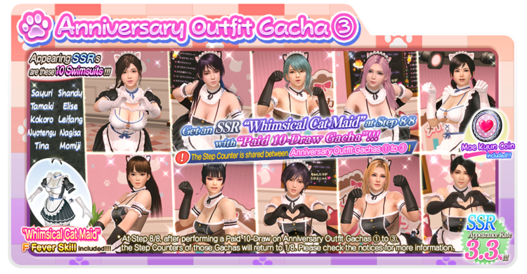 Furthermore, when any “Anniversary Outfit Gacha ① ~ ③” is at “Step 8/8,” doing a Paid 10-Draw Gacha from them will return all Gachas that share the same step count to “Step 1/8.”
