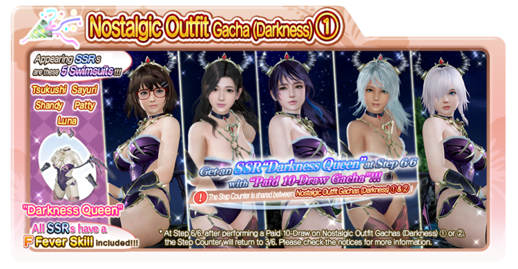 Performing a Paid 10-Draw Gacha at Step 6/6 will guarantee an SSR Swimsuit “Darkness Queen.”