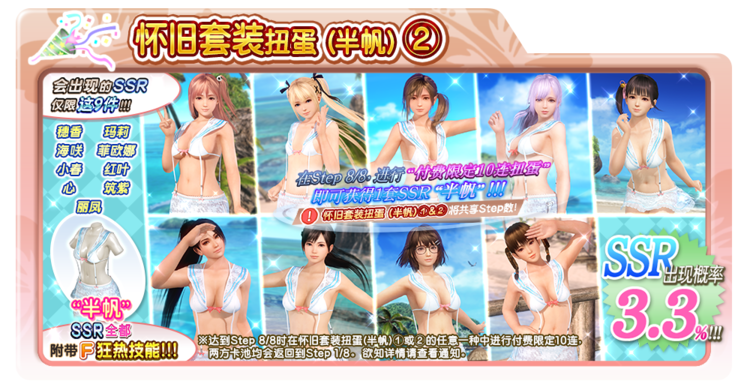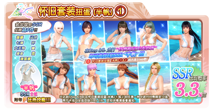 达到“Step 8/8”时,在“怀旧套装扭蛋(半帆)①&②”中任选其一进行付费限定10连扭蛋,与此扭蛋共享Step的卡池将一同返回“Step 1/8”。