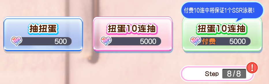 | ※ | 在进行“Step 8/8”的付费限定10连扭蛋时,“SR或以上保底名额”将变为“SSR保底名额”。 |