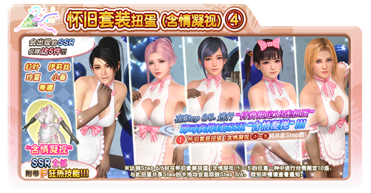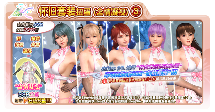 达到“Step 6/6”时,在“怀旧套装扭蛋(含情凝视)①~⑤”中任选其一进行付费限定10连扭蛋,与此扭蛋共享Step的卡池将一同返回“Step 3/6”。