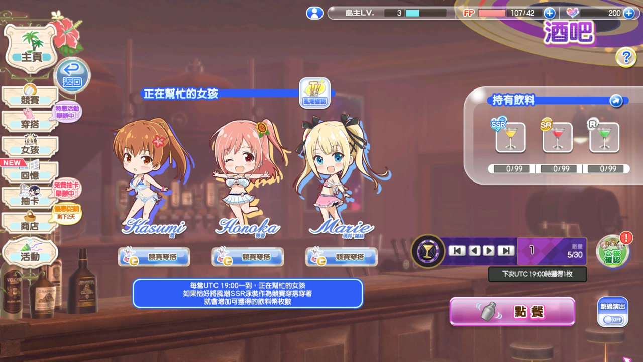 此外,按下酒吧畫面的「女孩確認」按鈕,可以選擇最多3名女孩前來幫忙。每天UTC 19:00一到,正在幫忙的女孩如果剛好將風潮穿搭穿著作為競賽穿搭,就會增加可獲得的「飲料硬幣」枚數!
