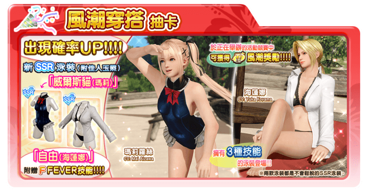 在同時舉辦的「風潮穿搭抽卡」中,可以獲得新的SSR泳裝「威爾斯貓(瑪莉)」及「自由(海蓮娜)」。欲知更多詳情,請瀏覽相關公告。