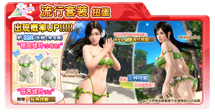 | ※ | PICK UP泳装比维纳斯扭蛋中相同稀有度的泳装的出现几率更高。 |